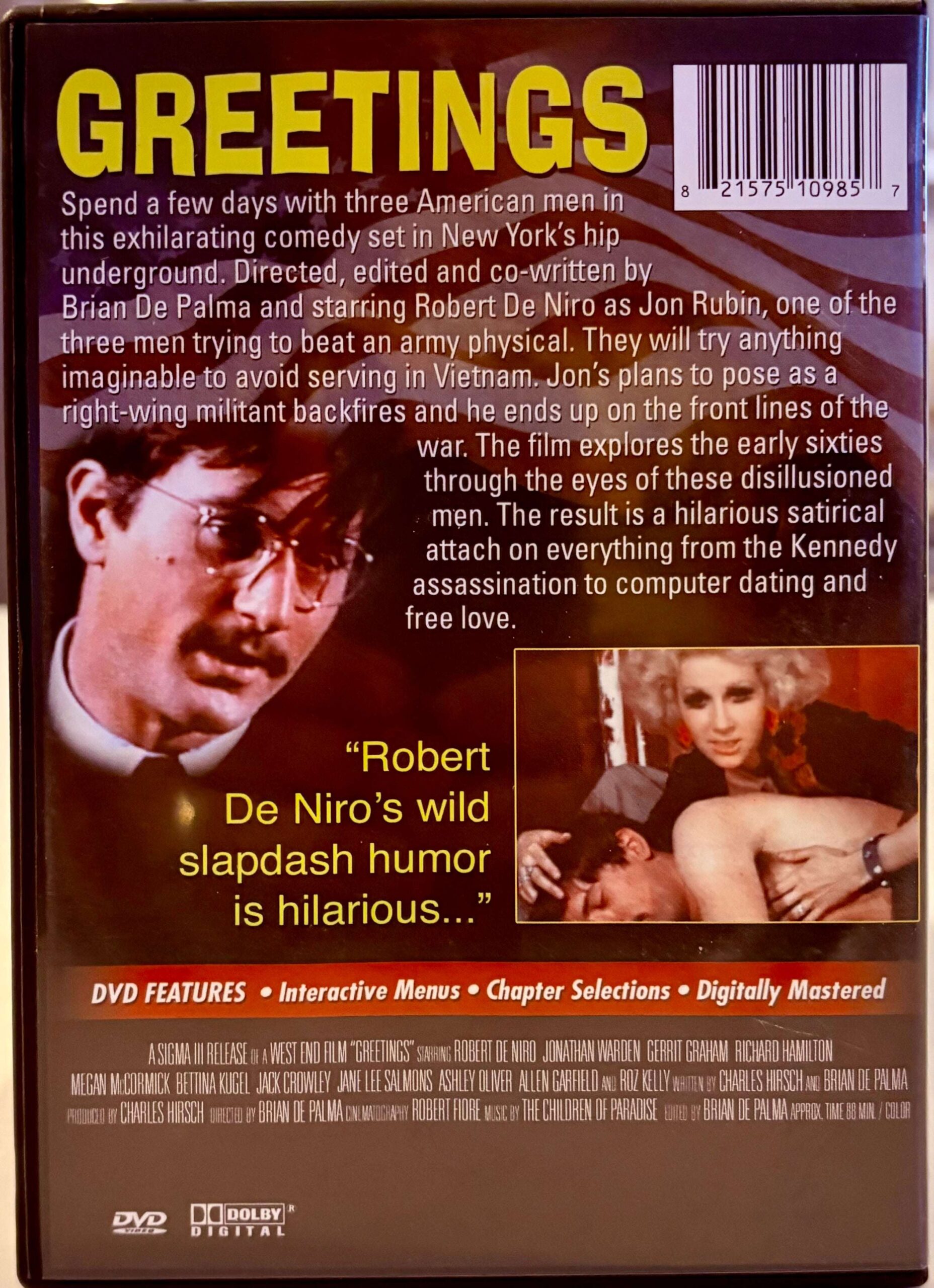 Greetings marks an early collaboration between director Brian De Palma and a young Robert De Niro in this cult black comedy. Released in 1968, the film showcases De Niro’s emerging talent alongside absurdist humor and satirical commentary. This out-of-print DVD edition captures a significant moment in both filmmakers’ careers, offering collectors and cinema enthusiasts a rare glimpse into their formative work. A must-have for De Palma devotees and classic film aficionados seeking unconventional 1960s cinema.