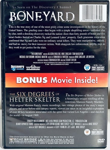 Introducing The Boneyard/The Six Degrees of Helter Skelter (DVD, 2009) Documentary TV*GR1—an ideal solution for those seeking rare and genuine documentary content. This DVD delivers authentic, out-of-print films that enhance your collection and viewing pleasure by offering:
